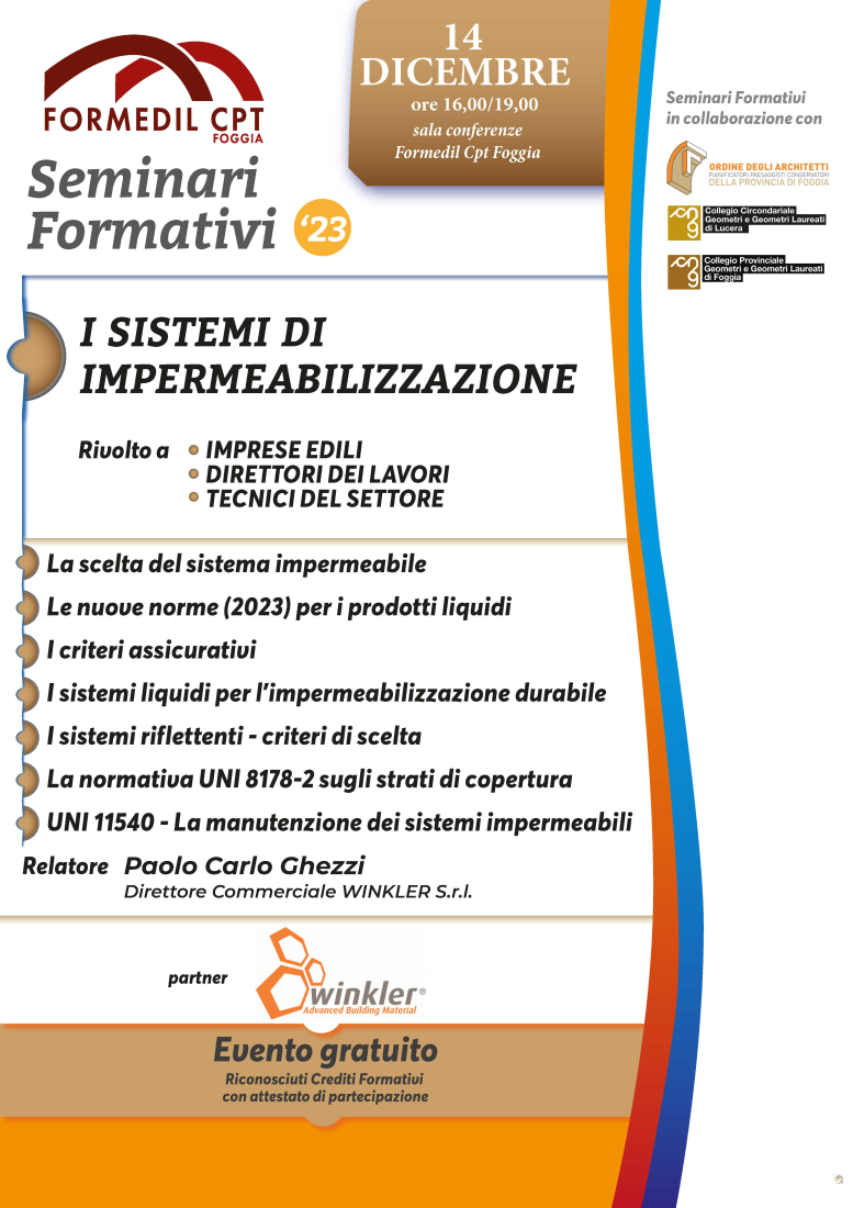 16.00 presso la Sala conferenze del Formedil Cpt Foggia, in co-organizzazione con l'Ordine degli Architetti di Foggia ed i Collegi dei Geometri di Foggia e Lucera e con la collaborazione tecnica della società Winkler, è organizzato un seminario gratuito sui sistemi di impermeabilizzazione.